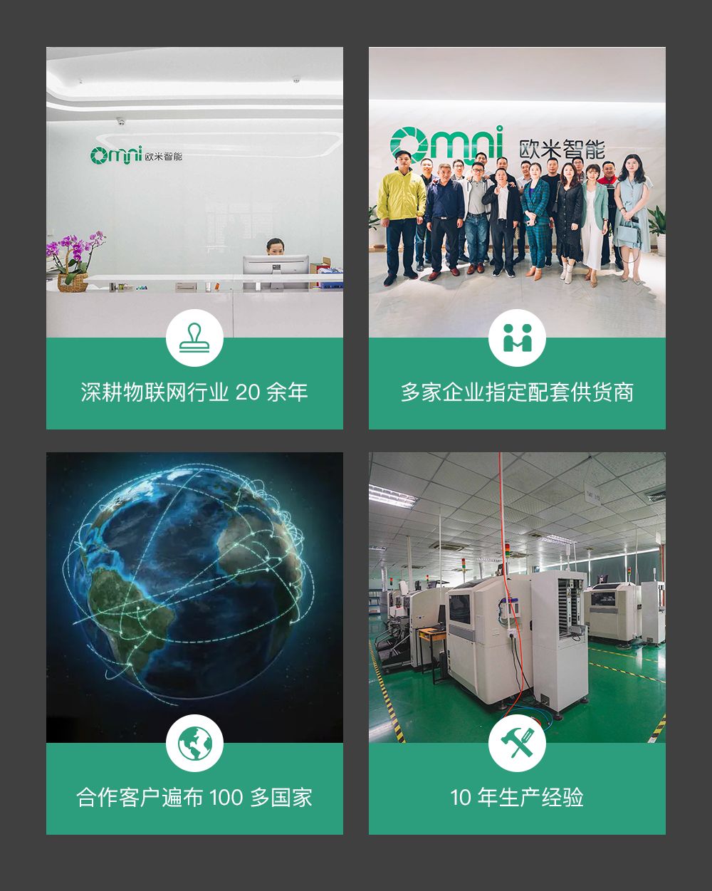 深圳歐米智能科技有限公司位于廣東省深圳市龍崗區南灣街道布瀾路21號聯創科技園3期31棟11樓,是一家專注于物聯網核心技術研發及應用的國家級高新技術企業辦公區與生產廠房面積約6000平方米,員工近200人,其中獨立研發團隊約50余人,為產品的開發和設計提供了強有力的保障。2018年度,公司被中國科學家論壇組委會授予“2018中國科技創新先進單位”、被深圳市市場監督管理局授予“2018年度廣東省守合同重信用企業”。